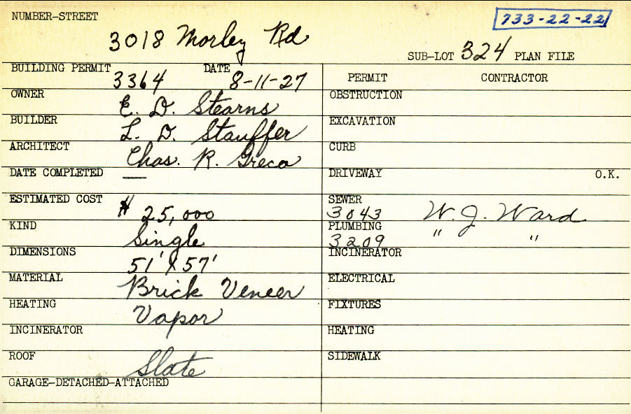 3018 Morley Road Shaker Heights, OH 44122 PARCEL ID: 733-22-022 Building Permit Date: 08-11-1927 Plan File Number: 0 Neighborhood: Malvern Owner: Stearns, E.D. Builder: Stauffer, L.D. Architect: Greco, Charles R. Estimated Cost: 25000 Kind: Single, Single Residence or Dwelling Material: Brick Veneer Heating: Vapor Roof: Slate Card Available: yes |