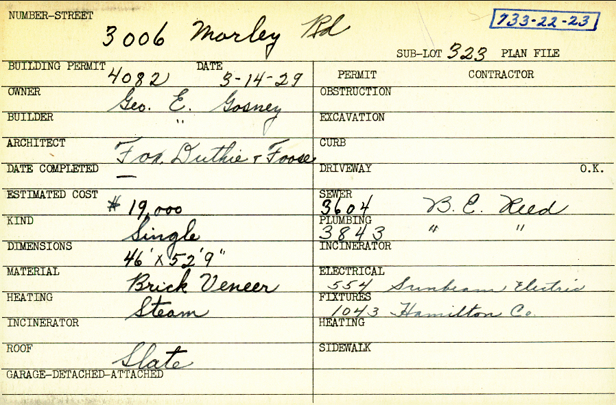 3006 Morley Road Shaker Heights, OH 44122 PARCEL ID: 733-22-023 Building Permit Date: 03-14-1929 Plan File Number: 6944 Microfilm Roll: Roll#90 Neighborhood: Malvern Owner: Gosney, George E. Builder: Gosney, George E. Architect: Fox, Duthie and Foose Estimated Cost: 19000 Kind: Single, Single Residence or Dwelling Material: Brick Veneer Heating: Steam Roof: Slate |