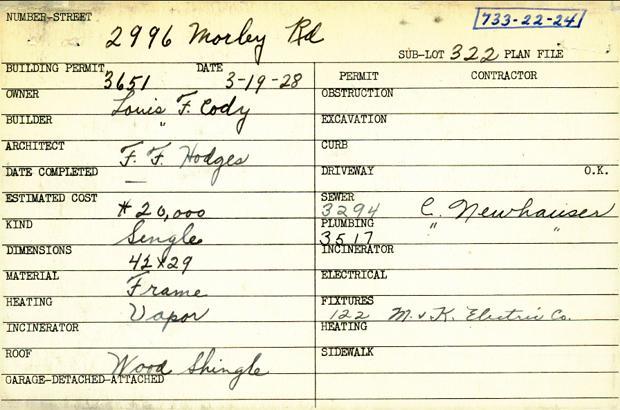 2996 Morley Road Shaker Heights, OH 44122 PARCEL ID: 733-22-024 Building Permit Date: 03-19-1928 Plan File Number: 4482, 12060 Microfilm Roll: Roll#63, NewRoll#11 Neighborhood: Malvern Owner: Cody, Louis F. Builder: Cody, Louis F. Architect: Hodges, Frederick F. Estimated Cost: 20000 Kind: Single, Single Residence or Dwelling Material: Frame Heating: Vapor Roof: Wood Shingle |