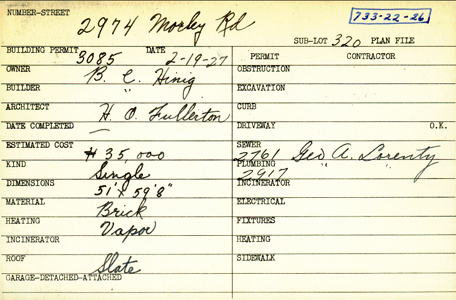 2974 Morley Road Shaker Heights, OH 44122 PARCEL ID: 733-22-026 Building Permit Date: 02-19-1927 Plan File Number: 0 Neighborhood: Malvern Owner: Hinig, B.C. Builder: Hinig, B.C. Architect: Fullerton, H. O. Estimated Cost: 35000 Kind: Single, Single Residence or Dwelling Material: Brick Heating: Vapor Roof: Slate |