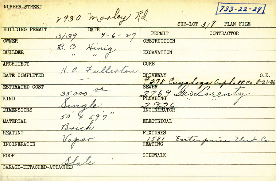 2930 Morley Road Shaker Heights, OH 44122 PARCEL ID: 733-22-029 Building Permit Date: 04-06-1927 Plan File Number: 1105 all scanned Microfilm Roll: Roll013 Neighborhood: Malvern Owner: Hinig, B. C. Builder: Hinig, B. C. Architect: Fullerton, H. O. Estimated Cost: 35000 Kind: Single, Single Residence or Dwelling Material: Brick Heating: Vapor Roof: Slate |