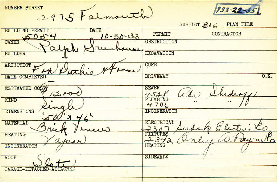 2975 Falmouth Road Shaker Heights, OH 44122 PARCEL ID: 733-22-035 Building Permit Date: 10-30-1933 Plan File Number: 12139 Microfilm Roll: NewRoll#11 Neighborhood: Malvern Owner: Greenhouse, Ralph Builder: Greenhouse, Ralph Architect: Fox, Duthie and Foose Estimated Cost: 12000 Kind: Single, Single Residence or Dwelling Material: Brick Veneer Heating: Vapor Roof: Slate |