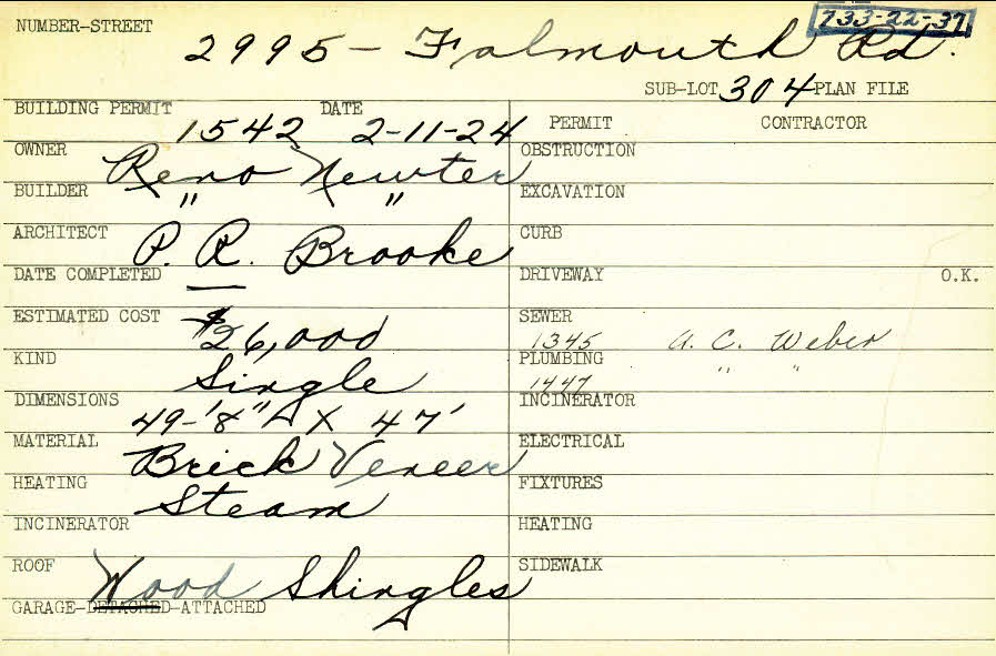 2995 Falmouth Road Shaker Heights, OH 44122 PARCEL ID: 733-22-037 Building Permit Date: 02-11-1924 Plan File Number: 11351 Microfilm Roll: NewRoll#7 Neighborhood: Malvern Owner: Newter, Reno Builder: Newter, Reno Architect: Brooke, Philo R. Estimated Cost: 26000 Kind: Single, Single Residence or Dwelling Material: Brick Veneer Heating: Steam Roof: Wood Shingle Garage: attached |