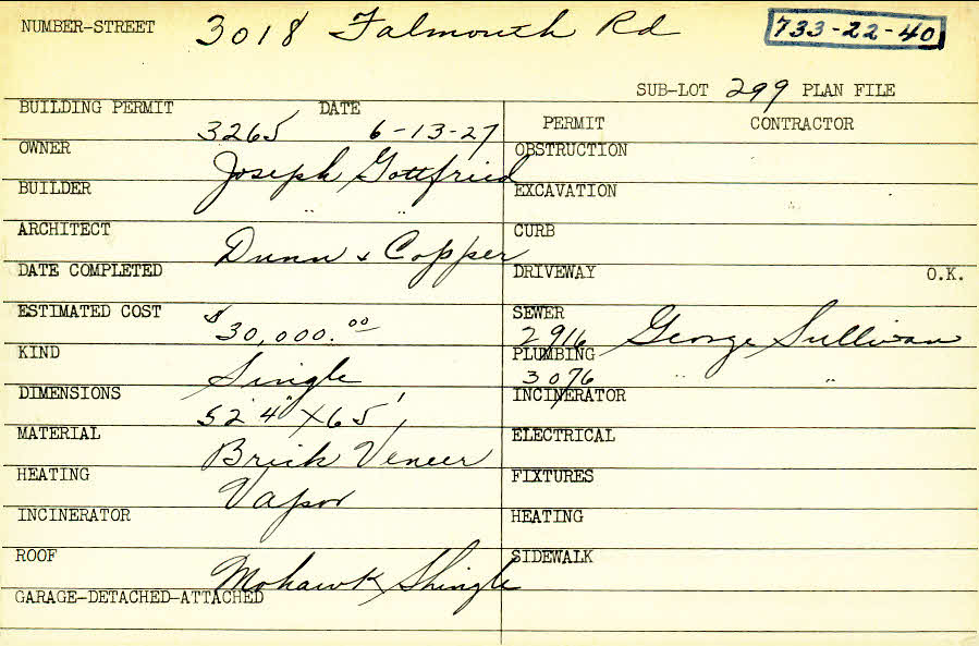 3018 Falmouth Road Shaker Heights, OH 44122 PARCEL ID: 733-22-040 Building Permit Date: 06-13-1927 Plan File Number: 93-29* Microfilm Roll: NewRoll#16 Neighborhood: Malvern Owner: Gottfried, Joseph Builder: Gottfried, Joseph Architect: Dunn and Copper Estimated Cost: 30000 Kind: Single, Single Residence or Dwelling Material: Brick Veneer Heating: Vapor Roof: Shingles |