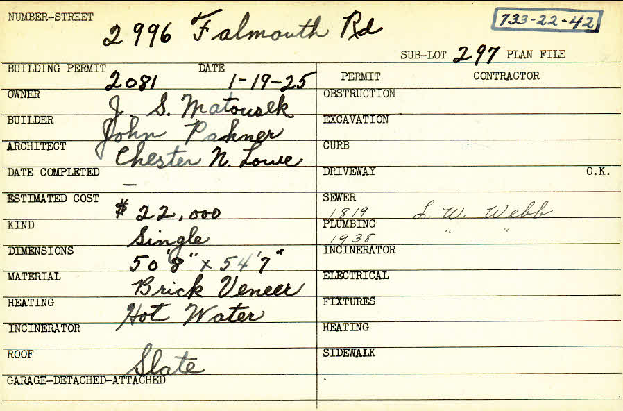 2996 Falmouth Road Shaker Heights, OH 44122 PARCEL ID: 733-22-042 Building Permit Date: 01-19-1925 Plan File Number: 0 Neighborhood: Malvern Owner: Matousek, J. S. Builder: Pahner, John Architect: Lowe, Chester N. Estimated Cost: 22000 Kind: Single, Single Residence or Dwelling Material: Brick Veneer Heating: Hot Water Roof: Slate Card Available: yes |