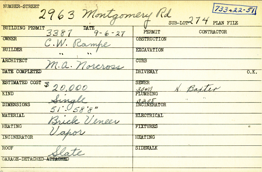 2963 Montgomery Road Shaker Heights, OH 44122 PARCEL ID: 733-22-051 Building Permit Date: 09-06-1927 Plan File Number: 0 Neighborhood: Malvern Owner: Rampe, C. W. Builder: Rampe, C. W. Architect: Norcross, M. A. Estimated Cost: 20000 Kind: Single, Single Residence or Dwelling Material: Brick Veneer Heating: Vapor Roof: Slate Garage: detached Card Available: yes |