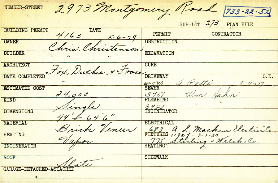 2973 Montgomery Road Shaker Heights, OH 44122 PARCEL ID: 733-22-052 Building Permit Date: 05-06-1929 Plan File Number: 3862, 6734 Microfilm Roll: Roll#56, Roll#88 Neighborhood: Malvern Owner: Christenson, Chris Builder: Christenson, Chris Architect: Fox, Duthie and Foose Estimated Cost: 24000 Kind: Single, Single Residence or Dwelling Material: Brick Veneer Heating: Vapor Roof: Slate |