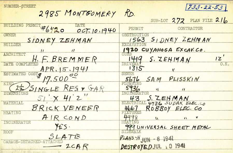 2985 Montgomery Road Shaker Heights, OH 44122 PARCEL ID: 733-22-053 Building Permit Date: 10-10-1940 Plan File Number: 216 Neighborhood: Malvern Owner: Zehman, Sidney Builder: Zehman, Sidney Architect: Bremmer, Harry F. Estimated Cost: 17500 Date Completed: 04-15-1941 Kind: Single 2-1/2 Material: Brick Veneer Heating: Air Conditioned Roof: Slate Garage: attached 2 car |