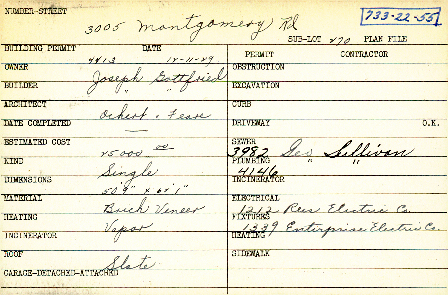 3005 Montgomery Road Shaker Heights, OH 44122 PARCEL ID: 733-22-055 Building Permit Date: 12-11-1929 Plan File Number: 0 Neighborhood: Malvern Owner: Gottfried, Joseph Builder: Gottfried, Joseph Architect: Ockert, Paul and Teare, George W. Estimated Cost: 25000 Kind: Single, Single Residence or Dwelling Material: Brick Veneer Heating: Vapor Roof: Slate |
