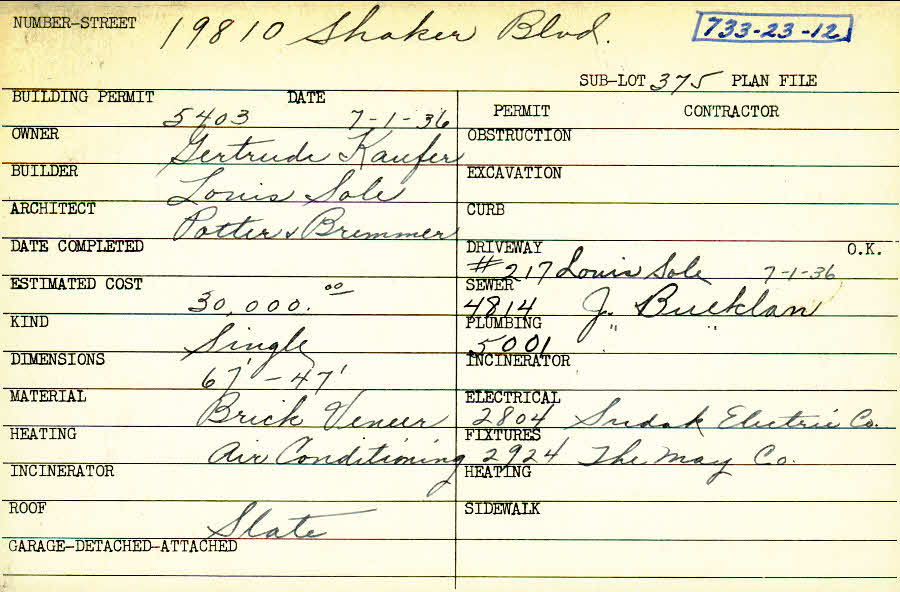 19810 Shaker Boulevard Shaker Heights, OH 44122 PARCEL ID: 733-23-012 Building Permit Date: 07-01-1936 Plan File Number: 0 Neighborhood: Malvern Owner: Kaufer, Gertrude Builder: Sole, Louis Architect: J. Ellsworth Potter and Harry F. Bremmer Estimated Cost: 30000 Kind: Single, Single Residence or Dwelling Material: Brick Veneer Heating: Air Conditioned Roof: Slate |