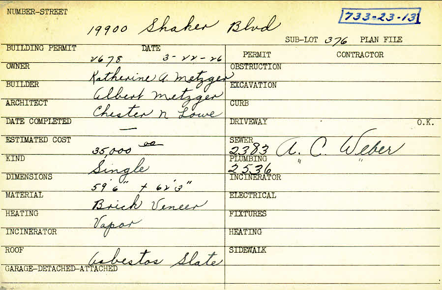 19900 Shaker Boulevard Shaker Heights, OH 44122 PARCEL ID: 733-23-013 Building Permit Date: 03-22-1926 Plan File Number: 0 Neighborhood: Malvern Owner: Metzger, Katherine A. Builder: Metzger, Albert Architect: Lowe, Chester N. Estimated Cost: 35000 Kind: Single, Single Residence or Dwelling Material: Brick Veneer Heating: Vapor Roof: Asbestos Card Available: yes |