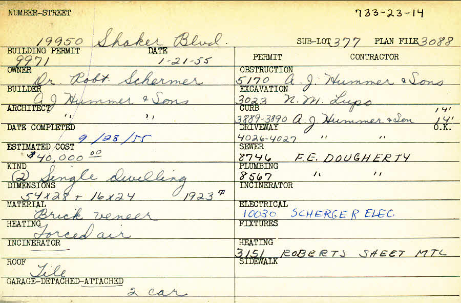 19950 Shaker Boulevard Shaker Heights, OH 44122 PARCEL ID: 733-23-014 Building Permit Date: 01-21-1955 Plan File Number: 3088, 6324 Microfilm Roll: Roll#43, Roll#85 Neighborhood: Malvern Owner: Schermer, Dr. Robert Builder: A. J. Hummer and Sons Architect: A. J. Hummer and Sons Estimated Cost: 40000 Date Completed: 09-28-1955 Kind: Single, Single Residence or Dwelling (2) Material: Brick Veneer Heating: Forced Air Roof: Tile Garage: attached 2 car |