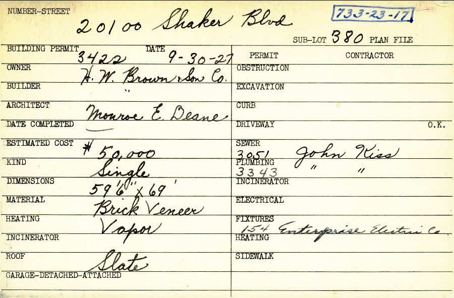20100 Shaker Boulevard Shaker Heights, OH 44122 PARCEL ID: 733-23-017 Building Permit Date: 09-30-1927 Plan File Number: 0 Neighborhood: Malvern Owner: H. W. Brown and Son Company Builder: H. W. Brown and Son Company Architect: Deane, Monroe Ensign Estimated Cost: 50000 Kind: Single, Single Residence or Dwelling Material: Brick Veneer Heating: Vapor Roof: Slate |