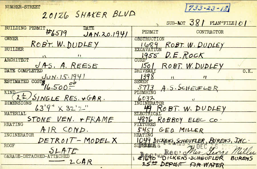 20126 Shaker Boulevard Shaker Heights, OH 44122 PARCEL ID: 733-23-018 Building Permit Date: 01-20-1941 Plan File Number: 101 Neighborhood: Malvern Owner: Dudley, Robert W. Builder: Dudley, Robert W. Architect: Reese, James A. Estimated Cost: 16500 Date Completed: 06-15-1941 Kind: Single 2-1/2 Material: Stone Veneer and Frame Heating: Air Conditioned Roof: Slate Garage: attached 2 car |
