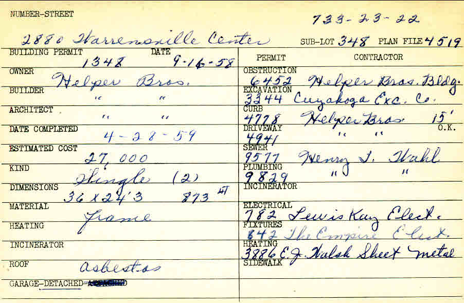 2880 Warrensville Center Road Shaker Heights, OH 44122 PARCEL ID: 733-23-022 Building Permit Date: 09-16-1958 Plan File Number: 4519 Microfilm Roll: Roll#63 Neighborhood: Malvern Owner: Helper Brothers Builder: Helper Brothers Architect: Helper Brothers Estimated Cost: 27000 Date Completed: 04-28-1959 Kind: Single, Single Residence or Dwelling (2) Material: Frame Roof: Asbestos Garage: detached |