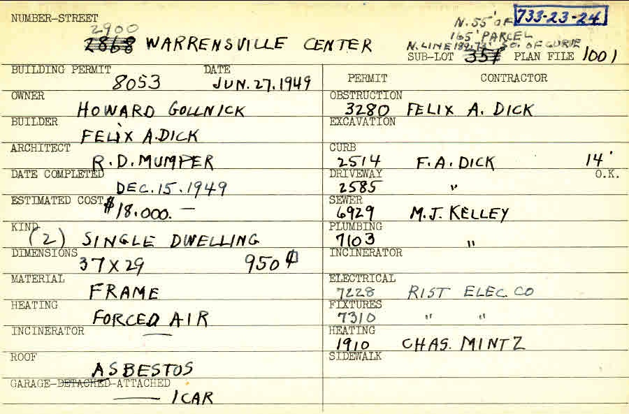 2900 Warrensville Center Road Shaker Heights, OH 44122 PARCEL ID: 733-23-024 Building Permit Date: 06-27-1949 Plan File Number: 1001 scanned, 4597 Microfilm Roll: Roll012, Roll#64 Neighborhood: Malvern Owner: Gollnick, Howard Builder: Dick, Felix A. Architect: Mumper, Richard D. Estimated Cost: 18000 Date Completed: 12-15-1949 Kind: Single, Single Residence or Dwelling (2) Material: Frame Heating: Forced Air Roof: Asbestos Garage: attached |