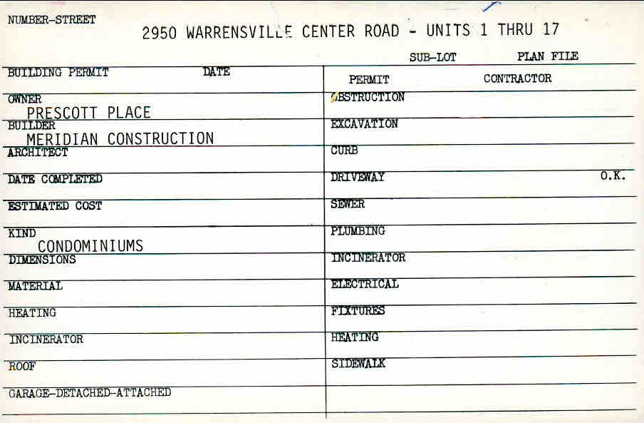 2950 Warrensville Center Road Shaker Heights, OH 44122 PARCEL ID: 733-23-027 Plan File Number: 5201, 5500, 92-108, 92-113, 11528*, 12573 all scanned Microfilm Roll: Roll072, Roll075, NewRoll01, NewRoll08, NewRoll14 Neighborhood: Malvern Owner: Prescott Place Builder: Meridian Construction Blueprints: online, see link above |
