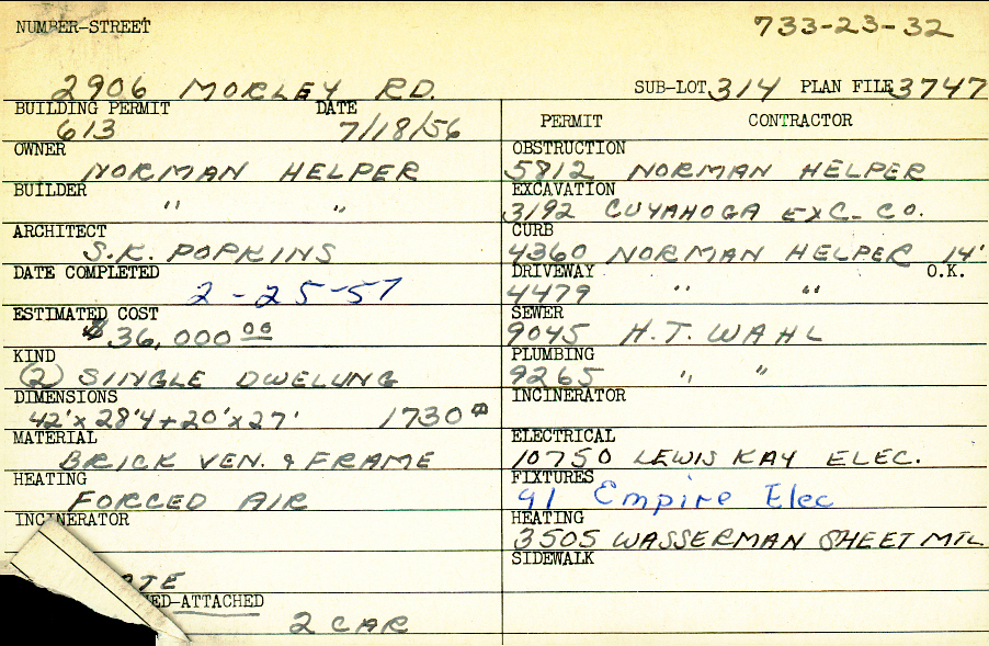 2906 Morley Road Shaker Heights, OH 44122 PARCEL ID: 733-23-032 Building Permit Date: 07-18-1956 Plan File Number: 3747 Microfilm Roll: Roll#51 Neighborhood: Malvern Owner: Helper, Norman Builder: Helper, Norman Architect: Popkins, S. K. Estimated Cost: 36000 Date Completed: 02-25-1957 Kind: Single, Single Residence or Dwelling (2) Material: Brick Veneer and Frame Heating: Forced Air Roof: Slate Garage: attached 2 car |