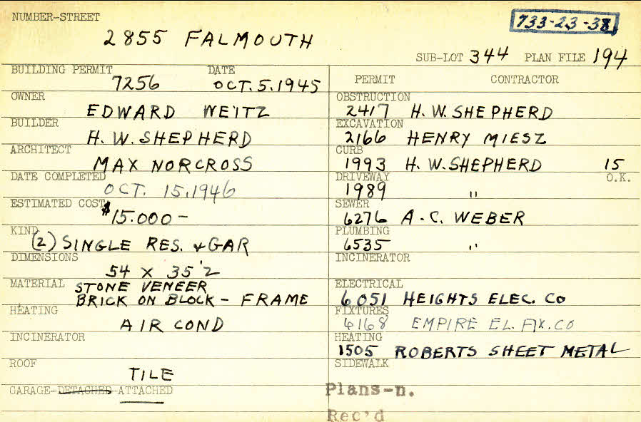 2855 Falmouth Road Shaker Heights, OH 44122 PARCEL ID: 733-23-038 Building Permit Date: 10-05-1945 Plan File Number: 194 scanned, 4001 Microfilm Roll: Roll002, Roll#58 Neighborhood: Malvern Owner: Weitz, Edward Builder: Shepherd, H. W. Architect: Norcross, Max Estimated Cost: 15000 Date Completed: 10-15-1946 Kind: Single Dwelling and Garage (2) Material: Stone Veneer, Brick on Block, and Frame Heating: Air Conditioned Roof: Tile Garage: attached |
