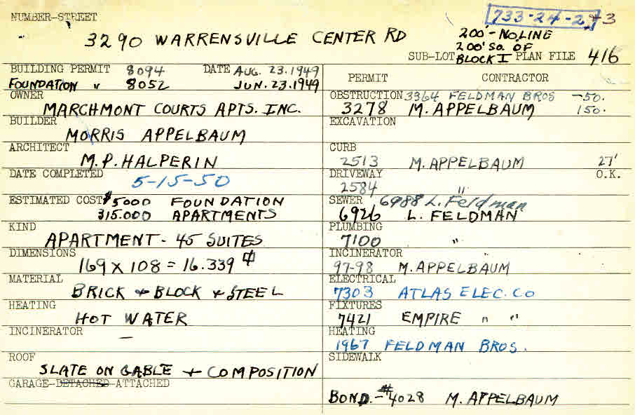 3290 Warrensville Center Road Shaker Heights, OH 44122 PARCEL ID: 733-24-002 Building Permit Date: 06-23-1949 Plan File Number: 416 all scanned Microfilm Roll: Roll004 Neighborhood: Malvern Owner: Marchmont Courts Apartments, Inc. Builder: Appelbaum, Morris Architect: Halperin, M. P. Estimated Cost: 320000 Date Completed: 05-15-1950 Kind: Apartment or Multi-family (3+) Material: Brick and Block and Steel Heating: Hot Water Garage: attached |