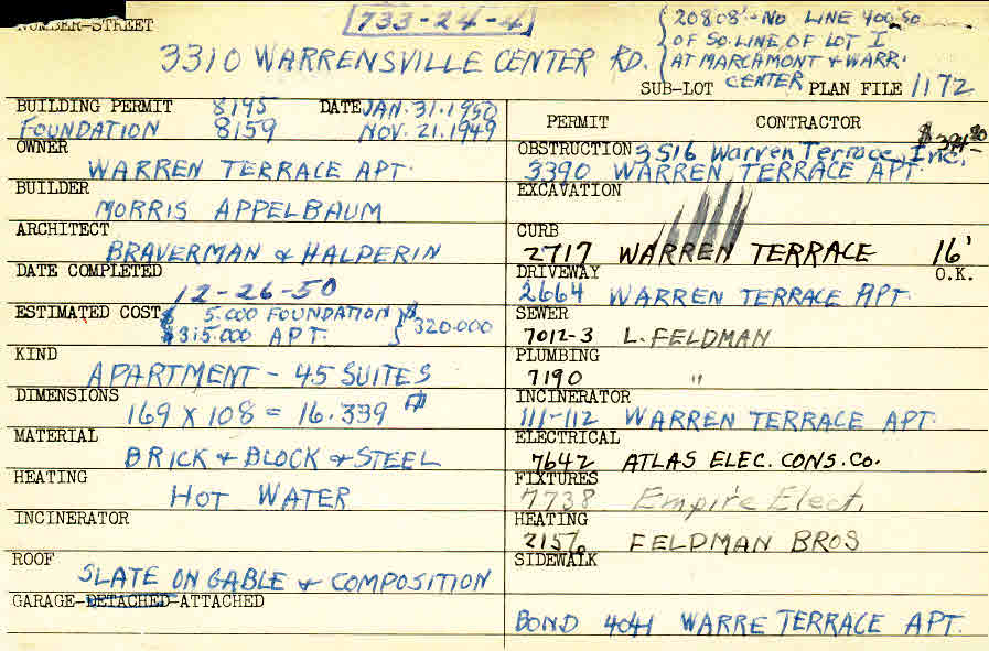 3310 Warrensville Center Road Shaker Heights, OH 44122 PARCEL ID: 733-24-004 Building Permit Date: 11-21-1949 Plan File Number: 1172 scanned, 4945 Microfilm Roll: Roll014, Roll#68 Neighborhood: Malvern Owner: Warren Terrace Apartment Builder: Appelbaum, Morris Architect: Braverman and Halperin Estimated Cost: 320000 Date Completed: 12-26-1950 Kind: Apartment or Multi-family (3+) Material: Brick and Block and Steel Heating: Hot Water Garage: attached |