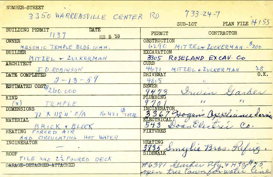 3350 Warrensville Center Road Shaker Heights, OH 44122 PARCEL ID: 733-24-007 Building Permit Date: 02-05-1958 Plan File Number: 4155, 93-30, 10432 Microfilm Roll: Roll#61, NewRoll#1, NewRoll#4 Neighborhood: Malvern Owner: Masonic Temple Building Committee Builder: Mitzel and Zuckerman Architect: Robinson, I. D. Estimated Cost: 260000 Date Completed: 02-13-1959 Material: Brick and Block Heating: Forced Air Roof: Tile |