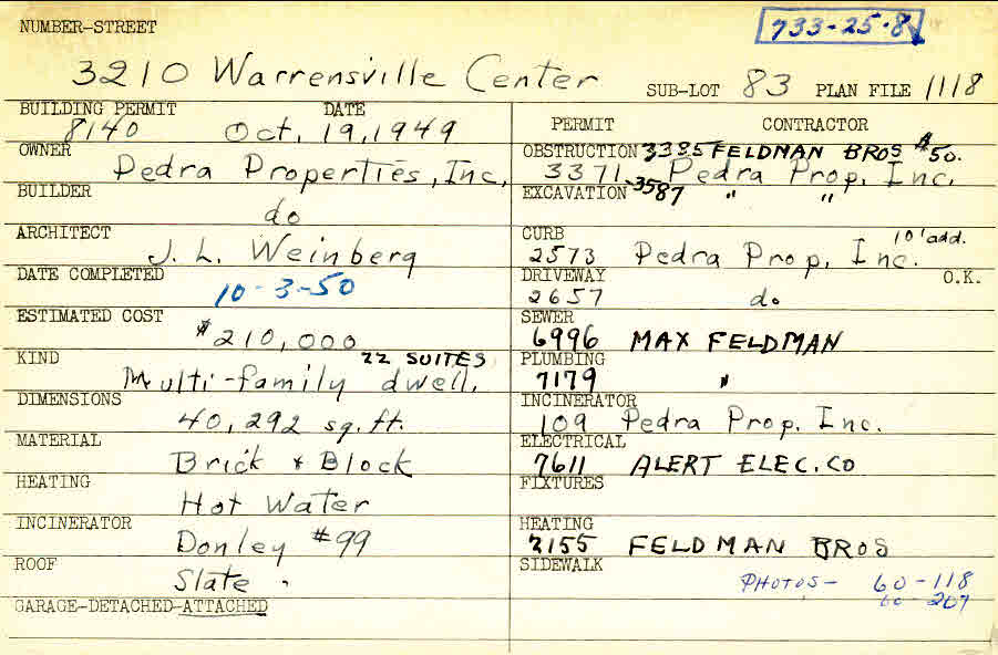 3210 Warrensville Center Road Shaker Heights, OH 44122 PARCEL ID: 733-25-008 Building Permit Date: 10-19-1949 Plan File Number: 1118 all scanned Microfilm Roll: Roll013 Neighborhood: Malvern Owner: Pedra Properties, Inc. Builder: Pedra Properties, Inc. Architect: Weinberg, J. L. Estimated Cost: 210000 Date Completed: 10-03-1950 Kind: Apartment or Multi-family (3+) Material: Brick and Block Heating: Hot Water Roof: Slate Garage: attached |