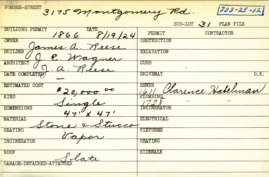 3175 Montgomery Road Shaker Heights, OH 44122 PARCEL ID: 733-25-012 Building Permit Date: 08-19-1924 Plan File Number: 0 Neighborhood: Malvern Owner: Reese, James A. Builder: Wagner, J. E. Architect: Reese, James A. Estimated Cost: 20000 Kind: Single, Single Residence or Dwelling Material: Stone and Stucco Heating: Vapor Roof: Slate |