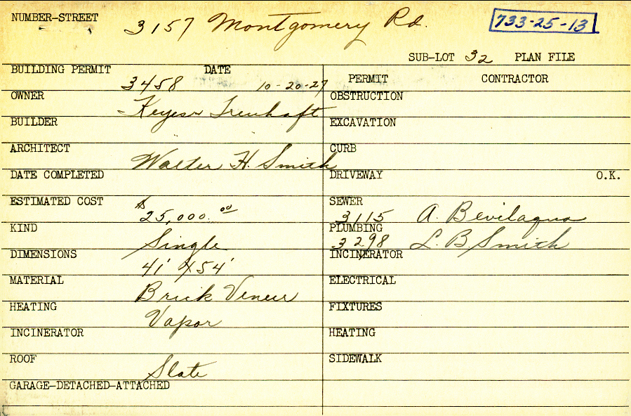 3157 Montgomery Road Shaker Heights, OH 44122 PARCEL ID: 733-25-013 Pictured in Keyes-Treuhaft's Distinctive Dwellings, p. 15 Building Permit Date: 10-20-1927 Neighborhood: Malvern Owner: Keyes and Treuhaft Builder: Keyes and Treuhaft Architect: Smith, Walter H. Estimated Cost: 25000 Kind: Single, Single Residence or Dwelling Material: Brick Veneer Heating: Vapor Roof: Slate Blueprints: no blueprints on microfilm |