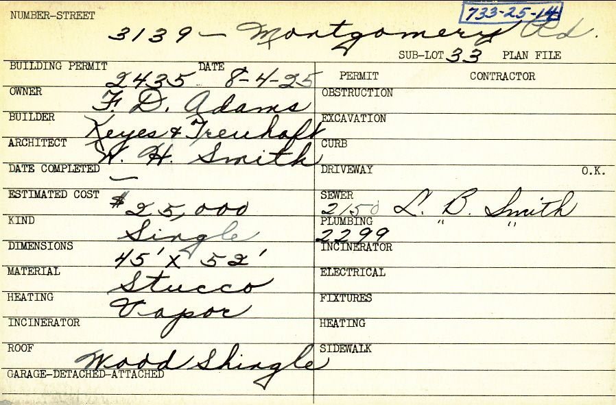 3139 Montgomery Road Shaker Heights, OH 44122 PARCEL ID: 733-25-014 Pictured in Keyes-Treuhaft's Distinctive Dwellings, p. 7 Building Permit Date: 08-04-1925 Neighborhood: Malvern Owner: Adams, F. D. Builder: Keyes and Treuhaft Architect: Smith, W. H. Estimated Cost: 25000 Kind: Single, Single Residence or Dwelling Material: Stucco Heating: Vapor Roof: Wood Shingle Blueprints: no blueprints on microfilm |