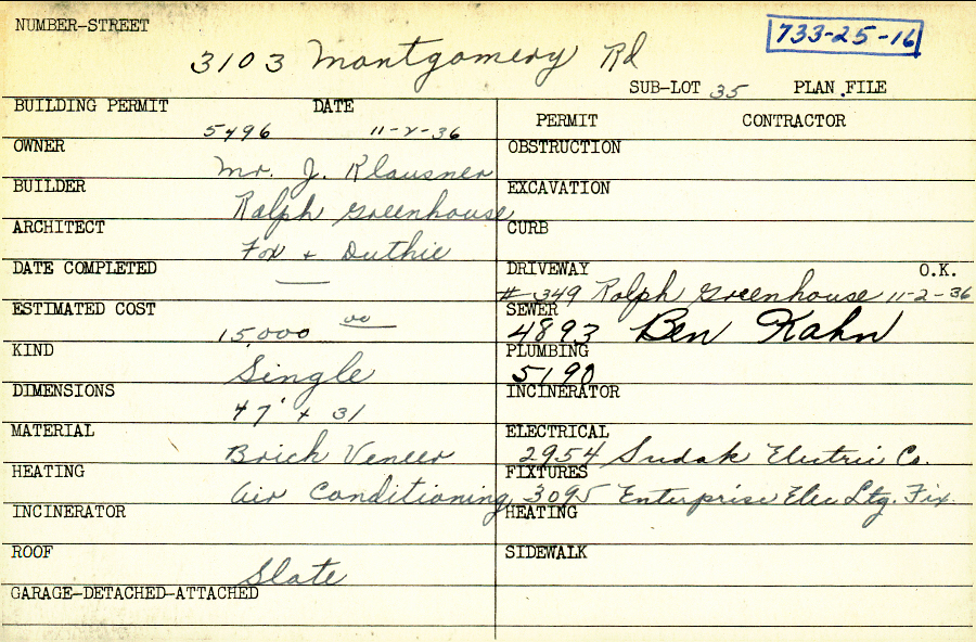 3103 Montgomery Road Shaker Heights, OH 44122 PARCEL ID: 733-25-016 Building Permit Date: 11-02-1936 Plan File Number: 0 Neighborhood: Malvern Owner: Klausner, J. Builder: Greenhouse, Ralph Architect: Fox and Duthie Estimated Cost: 15000 Kind: Single, Single Residence or Dwelling Material: Brick Veneer Heating: Air Conditioned Roof: Slate Card Available: yes |