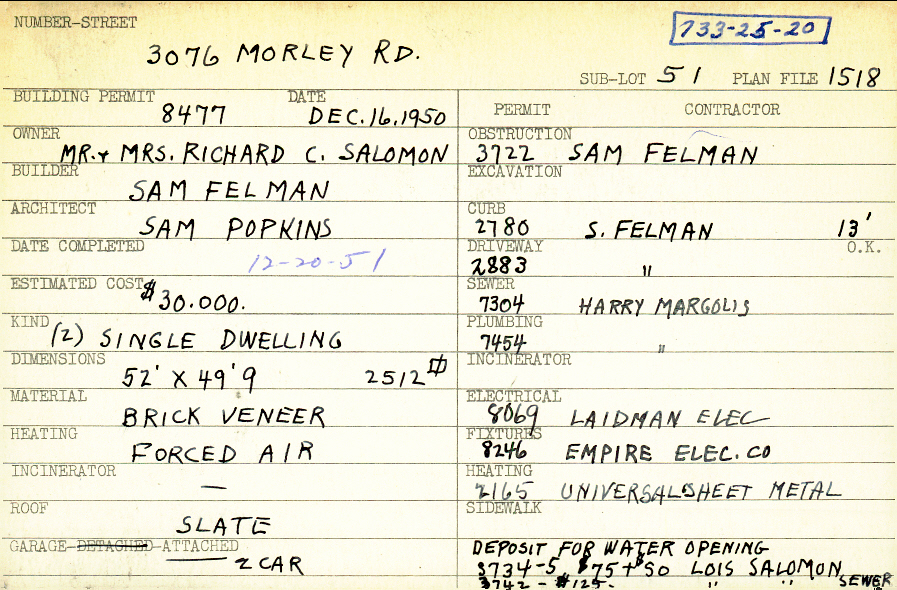 3076 Morley Road Shaker Heights, OH 44122 PARCEL ID: 733-25-020 Building Permit Date: 12-16-1950 Plan File Number: 1518 Microfilm Roll: Roll#24 Neighborhood: Malvern Owner: Salomon, Mr. and Mrs. Richard C. Builder: Felman, Sam Architect: Popkins, Sam Estimated Cost: 30000 Date Completed: 12-20-1951 Kind: Single, Single Residence or Dwelling (2) Material: Brick Veneer Heating: Forced Air Roof: Slate Garage: attached 2 car |