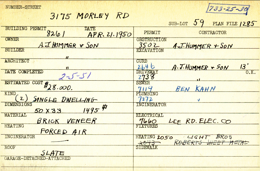 3175 Morley Road Shaker Heights, OH 44122 PARCEL ID: 733-25-030 Building Permit Date: 04-21-1950 Plan File Number: 1285 scanned, 3201, 7588 Microfilm Roll: Roll015, Roll#47, Roll#93 Neighborhood: Malvern Owner: A. J. Hummer and Sons Builder: A. J. Hummer and Sons Architect: A. J. Hummer and Sons Estimated Cost: 28000 Date Completed: 02-05-1951 Kind: Single, Single Residence or Dwelling (2) Material: Brick Veneer Heating: Forced Air Roof: Slate |