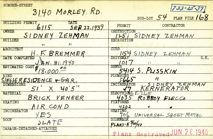 3140 Morley Road Shaker Heights, OH 44122 PARCEL ID: 733-25-037 Building Permit Date: 09-22-1939 Plan File Number: 168, 5962 Microfilm Roll: Roll#80 Neighborhood: Malvern Owner: Zehman, Sidney Builder: Zehman, Sidney Architect: Bremmer, Harry F. Estimated Cost: 18000 Date Completed: 01-31-1940 Kind: Single Dwelling and Garage Material: Brick Veneer Heating: Air Conditioned Roof: Slate Garage: attached |