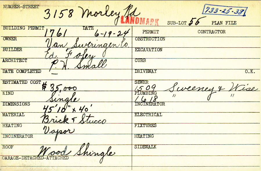 3158 Morley Road Shaker Heights, OH 44122 PARCEL ID: 733-25-038 Building Permit Date: 06-19-1924 Plan File Number: 91-131, 12602, 12913 scanned Microfilm Roll: NewRoll#1, NewRoll#14, NewRoll19 Neighborhood: Malvern Owner: Van Sweringen Company Builder: Foley, Ed Architect: Small, P. H. Estimated Cost: 35000 Kind: Single, Single Residence or Dwelling Material: Brick and Stucco Heating: Vapor Roof: Wood Shingle |