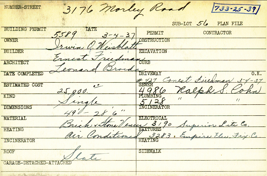 3176 Morley Road Shaker Heights, OH 44122 PARCEL ID: 733-25-039 Building Permit Date: 03-04-1937 Neighborhood: Malvern Owner: Weisblatt, Irwin O. Builder: Friedman, Ernest Architect: Broida, Leonard Estimated Cost: 25000 Kind: Single, Single Residence or Dwelling Material: Brick and Stone Veneer Heating: Air Conditioned Roof: Slate Blueprints: no blueprints on microfilm |