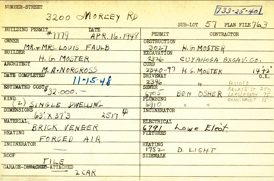 3200 Morley Road Shaker Heights, OH 44122 PARCEL ID: 733-25-040 Building Permit Date: 04-16-1948 Plan File Number: 763 all scanned Microfilm Roll: Roll010 Neighborhood: Malvern Owner: Faulb, Mr. and Mrs. Louis Builder: Moster, H. G. Architect: Norcross, M. A. Estimated Cost: 32000 Date Completed: 11-15-1948 Kind: Single, Single Residence or Dwelling (2) Material: Brick Veneer Heating: Forced Air Roof: Tile Garage: attached 2 car |