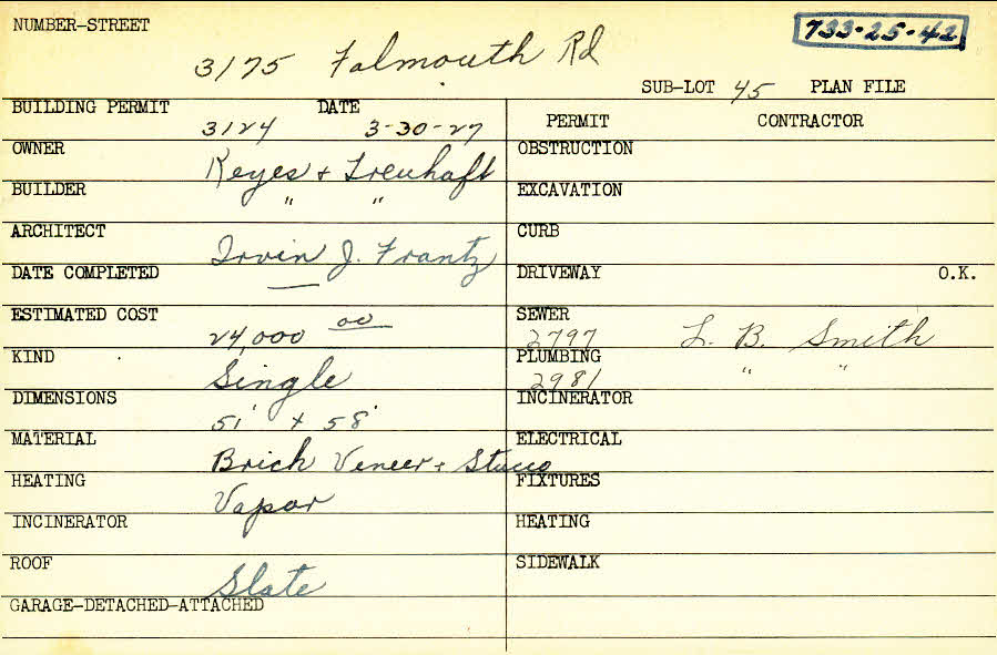 3175 Falmouth Road Shaker Heights, OH 44122 PARCEL ID: 733-25-042 Building Permit Date: 03-30-1927 Plan File Number: 0 Neighborhood: Malvern Owner: Keyes and Treuhaft Builder: Keyes and Treuhaft Architect: Frantz, Irvin J. Estimated Cost: 24000 Kind: Single, Single Residence or Dwelling Material: Brick Veneer and Stucco Heating: Vapor Roof: Slate Card Available: yes |