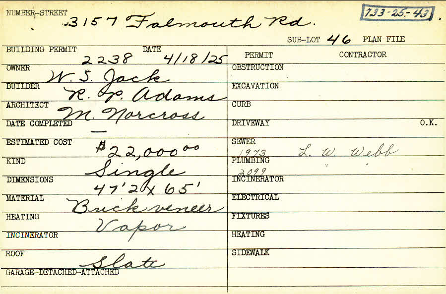 3157 Falmouth Road Shaker Heights, OH 44122 PARCEL ID: 733-25-043 Building Permit Date: 04-18-1925 Plan File Number: 0 Neighborhood: Malvern Owner: Jack, W. S. Builder: Adams, R. P. Architect: Norcross, M. Estimated Cost: 22000 Kind: Single, Single Residence or Dwelling Material: Brick Veneer Heating: Vapor Roof: Slate Card Available: yes |
