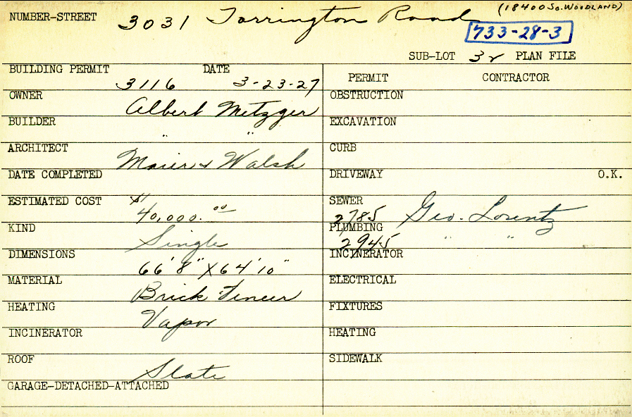3031 Torrington Road Shaker Heights, OH 44122 PARCEL ID: 733-28-003 Building Permit Date: 03-23-1927 Plan File Number: 0 Neighborhood: Malvern Owner: Metzger, Albert Builder: Metzger, Albert Architect: Maier and Walsh Estimated Cost: 40000 Kind: Single, Single Residence or Dwelling Material: Brick Veneer Heating: Vapor Roof: Slate |