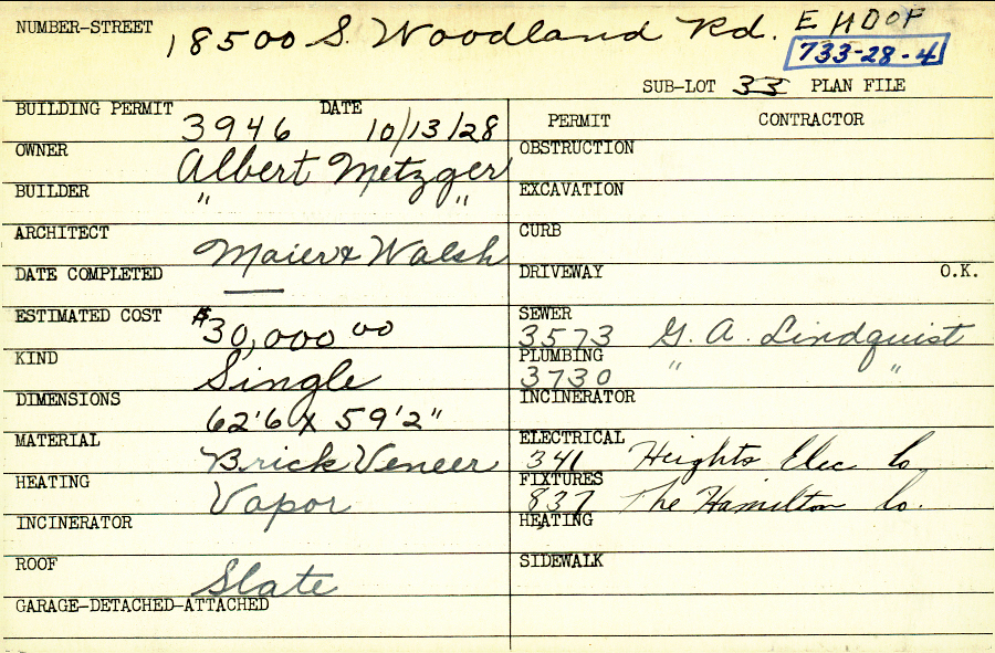 18500 South Woodland Road Shaker Heights, OH 44122 PARCEL ID: 733-28-004 Building Permit Date: 10-13-1928 Plan File Number: 0 Neighborhood: Malvern Owner: Metzger, Albert Builder: Metzger, Albert Architect: Maier and Walsh Estimated Cost: 30000 Kind: Single, Single Residence or Dwelling Material: Brick Veneer Heating: Vapor Roof: Slate Card Available: yes |