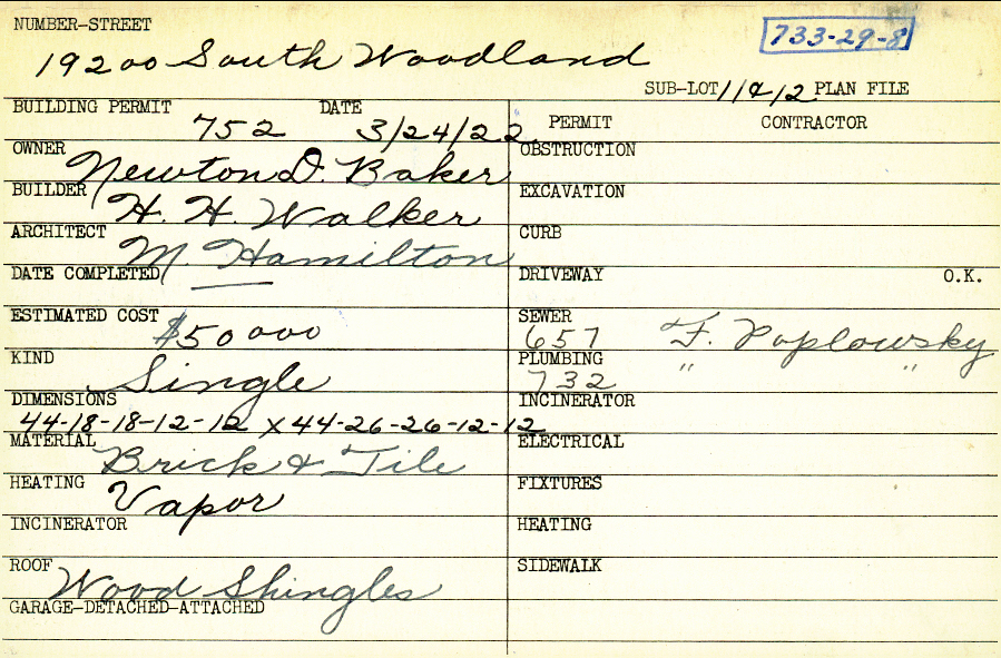 19200 South Woodland Road Shaker Heights, OH 44122 PARCEL ID: 733-29-008 Building Permit Date: 03-24-1922 Plan File Number: 7805 Microfilm Roll: Roll#94 Neighborhood: Malvern Owner: Baker, Newton D. Builder: Walker, H. H. Architect: Hamilton, M. Estimated Cost: 50000 Kind: Single, Single Residence or Dwelling Material: Brick and Tile Heating: Vapor Roof: Wood Shingle |
