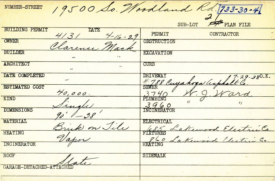 19500 South Woodland Road Shaker Heights, OH 44122 PARCEL ID: 733-30-004 Building Permit Date: 04-16-1929 Plan File Number: 11527 all scanned Microfilm Roll: NewRoll08 Neighborhood: Malvern Owner: Mack, Clarence Builder: Mack, Clarence Architect: Mack, Clarence Estimated Cost: 40000 Kind: Single, Single Residence or Dwelling Material: Brick on Tile Heating: Vapor Roof: Slate |