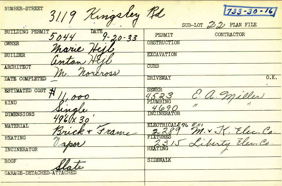 3119 Kingsley Road Shaker Heights, OH 44122 PARCEL ID: 733-30-016 Building Permit Date: 09-20-1933 Plan File Number: 5595 Microfilm Roll: Roll#76 Neighborhood: Malvern Owner: Hejl, Marie Builder: Hejl, Anton Architect: Norcross, M. Estimated Cost: 11000 Kind: Single, Single Residence or Dwelling Material: Brick and Frame Heating: Vapor Roof: Slate |