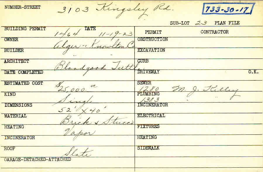 3103 Kingsley Road Shaker Heights, OH 44122 PARCEL ID: 733-30-017 Building Permit Date: 11-19-1923 Plan File Number: 0 Neighborhood: Malvern Owner: Alger-Knowlton Company Builder: Alger-Knowlton Company Architect: Tuttle, Bloodgood Estimated Cost: 25000 Kind: Single, Single Residence or Dwelling Material: Brick and Stucco Heating: Vapor Roof: Slate Card Available: yes |