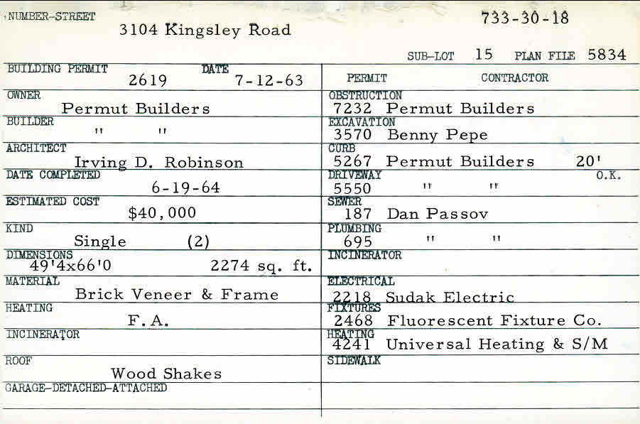 3104 Kingsley Road Shaker Heights, OH 44122 PARCEL ID: 733-30-018 Building Permit Date: 07-12-1963 Plan File Number: 5834 Microfilm Roll: Roll#79 Neighborhood: Malvern Owner: Permut Builders Builder: Permut Builders Architect: Robinson, Irving D. Estimated Cost: 40000 Date Completed: 06-19-1964 Kind: Single, Single Residence or Dwelling (2) Material: Brick Veneer and Frame Heating: Forced Air Roof: Wood Shakes |
