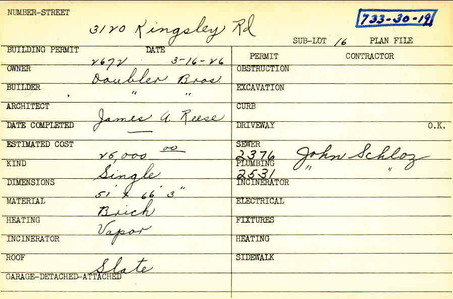 3120 Kingsley Road Shaker Heights, OH 44122 PARCEL ID: 733-30-019 Building Permit Date: 03-16-1926 Plan File Number: 0 Neighborhood: Malvern Owner: Doubler Brothers Builder: Doubler Brothers Architect: Reese, James A. Estimated Cost: 25000 Kind: Single, Single Residence or Dwelling Material: Brick Heating: Vapor Roof: Slate Card Available: yes |