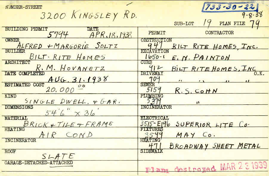 3200 Kingsley Road Shaker Heights, OH 44122 PARCEL ID: 733-30-022 Building Permit Date: 04-18-1938 Plan File Number: 79, 6323 Microfilm Roll: Roll#85 Neighborhood: Malvern Owner: Soltz, Alfred and Margorie Builder: Bilt-Rite Homes Architect: Hovanetz, R. M. Estimated Cost: 20000 Date Completed: 08-31-1938 Kind: Single Dwelling and Garage Material: Brick and Tile and Frame Heating: Air Conditioned Roof: Slate Garage: attached |