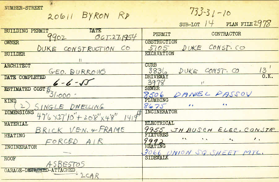 20611 Byron Road Shaker Heights, OH 44122 PARCEL ID: 733-31-010 Building Permit Date: 10-27-1954 Plan File Number: 2978 Microfilm Roll: Roll#42 Neighborhood: Mercer Owner: Duke Construction Company Builder: Duke Construction Company Architect: Burrows, George Estimated Cost: 31000 Date Completed: 06-06-1955 Kind: Single, Single Residence or Dwelling (2) Material: Brick Veneer and Frame Heating: Forced Air Roof: Asbestos Garage: attached 2 car |