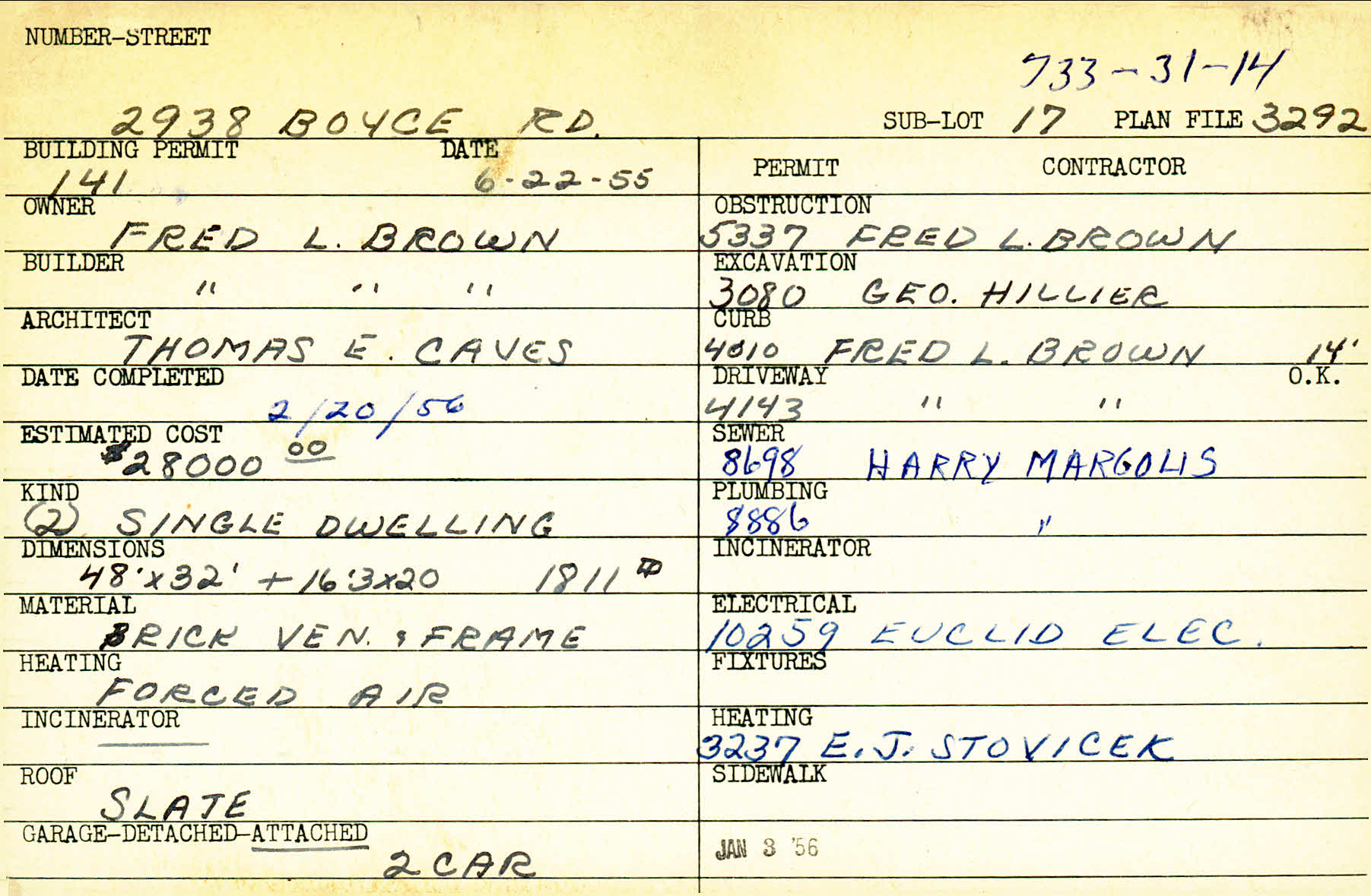 2938 Boyce Road Shaker Heights, OH 44122 PARCEL ID: 733-31-014 Building Permit Date: 06-22-1955 Plan File Number: 3292, 10970 Microfilm Roll: Roll#48, NewRoll#6 Neighborhood: Mercer Owner: Brown, Fred L. Builder: Brown, Fred L. Architect: Caves, Thomas E. Estimated Cost: 28000 Date Completed: 02-20-1956 Kind: Single, Single Residence or Dwelling (2) Material: Frame and Brick Veneer Heating: Forced Air Roof: Slate Garage: attached 2 car |